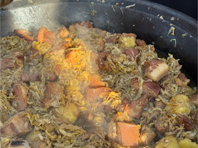 活動(dòng)現(xiàn)場(chǎng)的重頭戲,絕對(duì)是年豬菜烹飪巔峰對(duì)決賽。來自海南區(qū)8個(gè)行政村的民間燴酸菜高手現(xiàn)場(chǎng)烹飪,他們手法嫻熟,動(dòng)作流利,翻炒間肉香四溢。當(dāng)游客問及烹制的訣竅時(shí),大廚韓芒芒毫無保留:“要想做好豬肉燴酸菜,豬肉必須是我們農(nóng)村豬肉,還有就是不能跑了鍋氣,做出來的絕對(duì)原汁原味?!?/p>